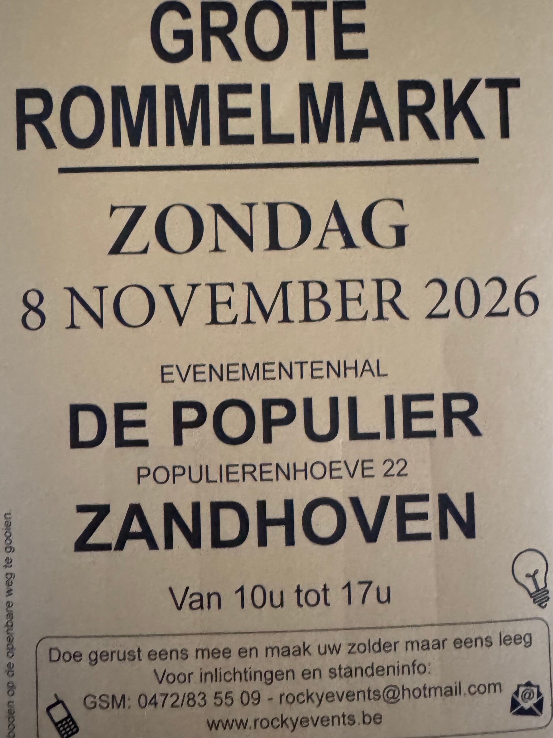 Grote overdekte rommelmarkt op zondag 8 november 2026 in evenementenhal De Populier in Zandhoven deelnameprijs 7€ per lopende meter en 10€ waarborg